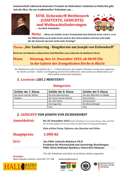 um 14:30  Gottesdienst  in Deutsch,  Weihnachtsmarkt Stand der DMi an Ring,  Feierlichestreffen und Wettbewerbe in der EK für ganze DMi aus Hultschiner Ländchen